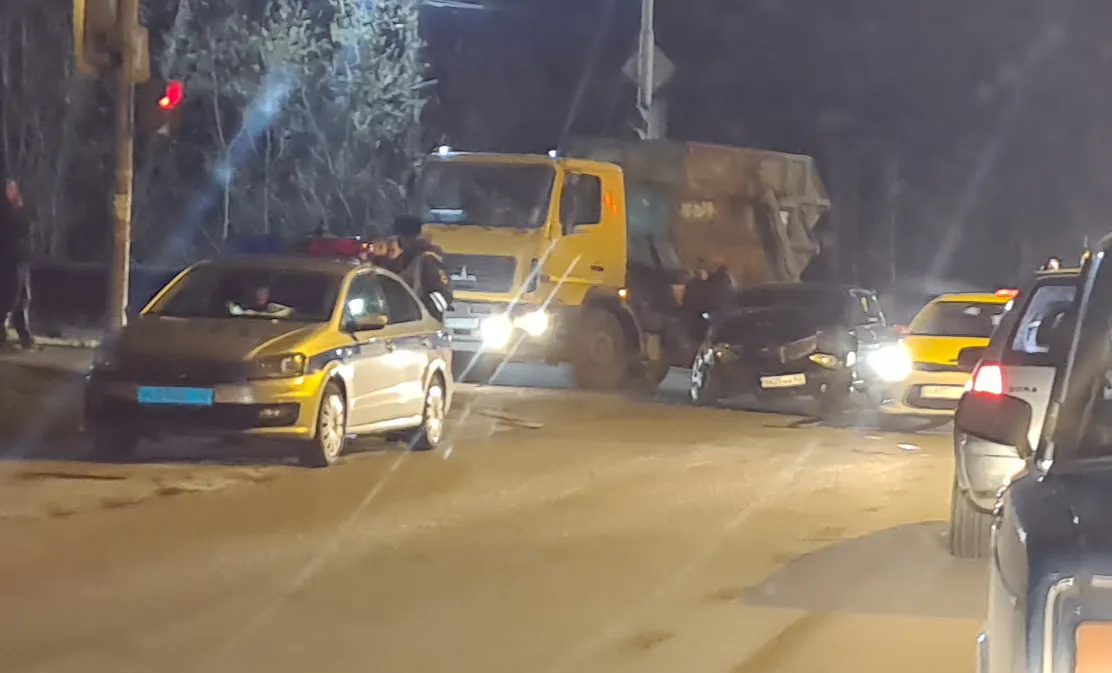 Поздно вечером 26 апреля в Рязани столкнулись мусоровоз и «Волга». Фото с места ДТП опубликованы в паблике "Подслушано у водителей Рязани".