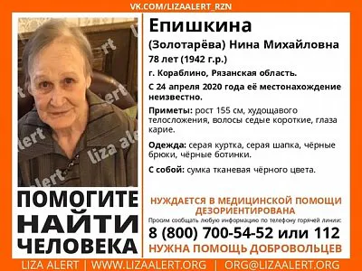 В городе Кораблино Рязанской области пропала 78-летняя местная жительница Нина Епишкина. Родные не видели ее с пятницы, 24 апреля, сообщают волонтеры "Лиза Алерт".