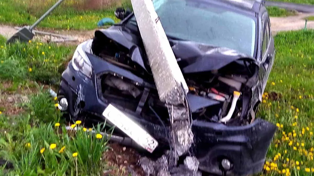 В результате ДТП столб не выдержал столкновения и рухнул на машину. Водитель чудом не пострадал, автомобиль получил серьезные повреждения.