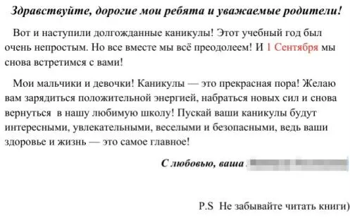 Сегодня школьники младших классов вместо домашних заданий и новых тем получили на электронную почту письма, в которых сообщается о начале каникул. Преподаватели желают ребятам набраться новых сил, и надеются, что каникулы будут интересными, увлекательными, веселыми и безопасными. Напомним, что дети ушли на дистанционное обучение еще в марте, и с тех пор в школьные класы не возвращались.