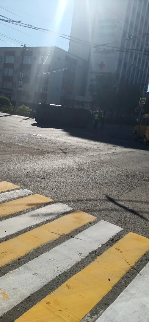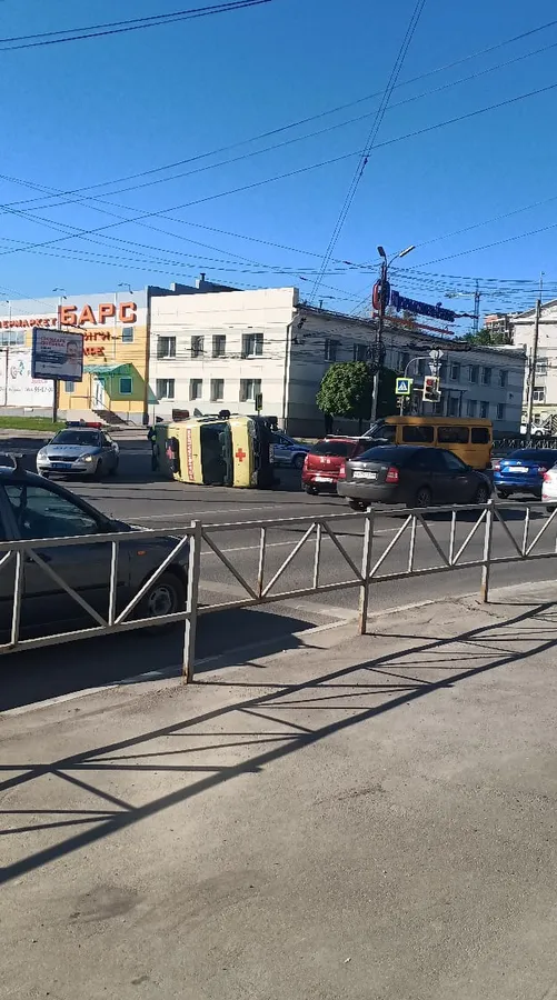 Утром 25 мая на перекрестке улиц Есенина и Грибоедова столкнулись маршрутка и автомобиль Скорой помощи. В результате аварии “скорая” перевернулась на бок. Автомобиль Скорой помощи увезли на эвакуаторе, у него помята задняя левая дверь.