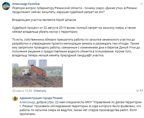 26 мая депутат Рязанской городской Думы Алексей Захаров на своей странице Вконтакте выложил пост, в котором рассказал о ситуации с озером “Дикая утка”. Захаров сообщил, что Администрация города не видит засыпку этого озера.