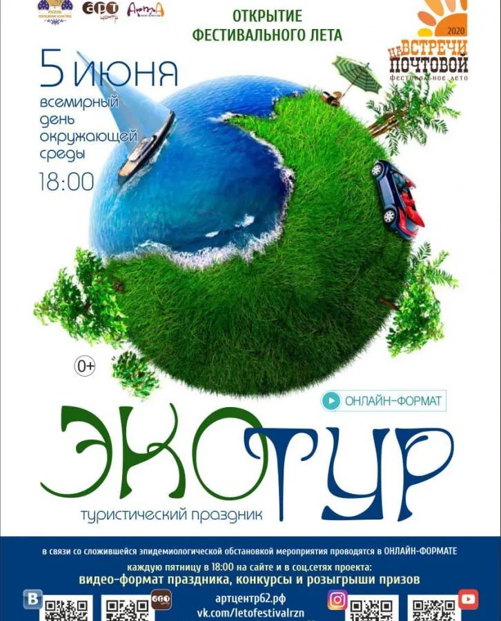 Откроется "Фестивальное лето" во Всемирный день окружающей среды. На сайте артцентр62.рф и в социальных сетях проекта в 18:00 стартует туристический праздник "Эко тур". Первым мероприятием станет туристический праздник "Эко тур". Список мероприятий «Арт-центра» доступен на сайте мэрии.
