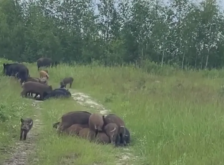 Под Рязанью около села Ласково засняли стадо диких кабанов. Пост об этом появился 16 июня в Инстаграм-аккаунте “ya.irinaa”. На видео видно как стадо из взрослых и маленьких особей ходит по лесу и останавливается на привал. Взрослые кабаны лежат в траве, а маленькие интересуются машиной с людьми. Автор поста сообщает:
