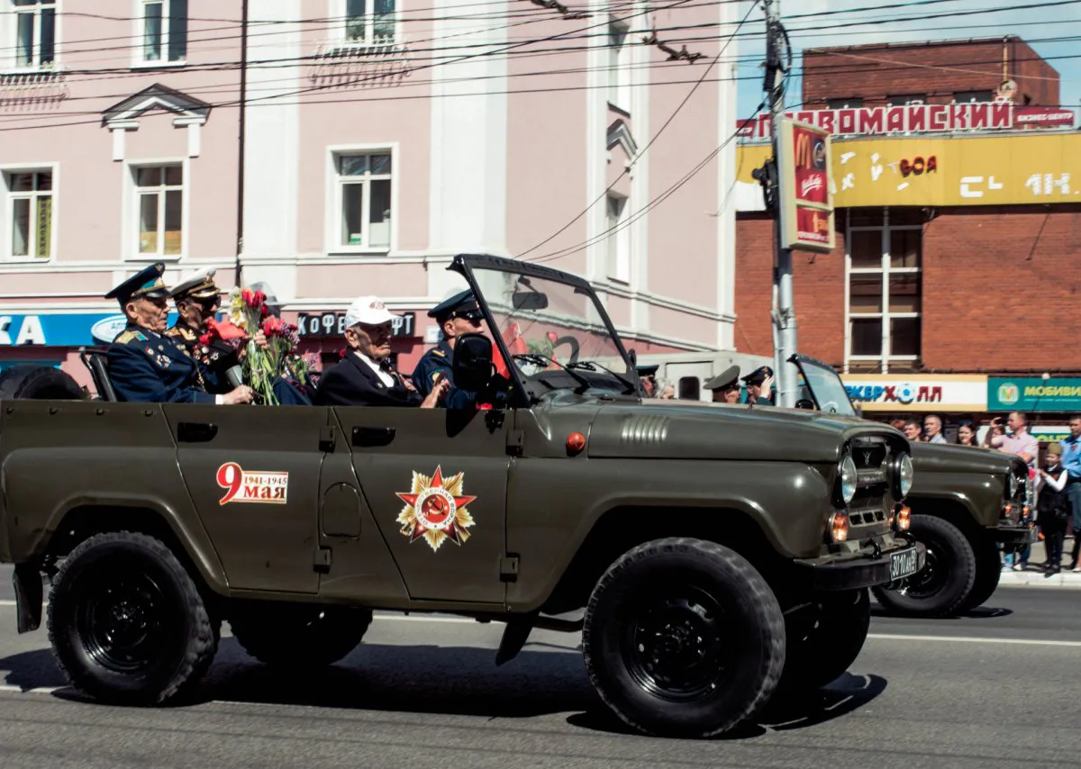 - 12:10 - мобильный смотр военной песни. 5 военный открытых автомобилей “КамАЗ” с музыкальными коллективами проедут по улицам города. Маршрут будет максимально приближен к тем местам, где живут ветераны. Движение на улицах перекрывать не будут