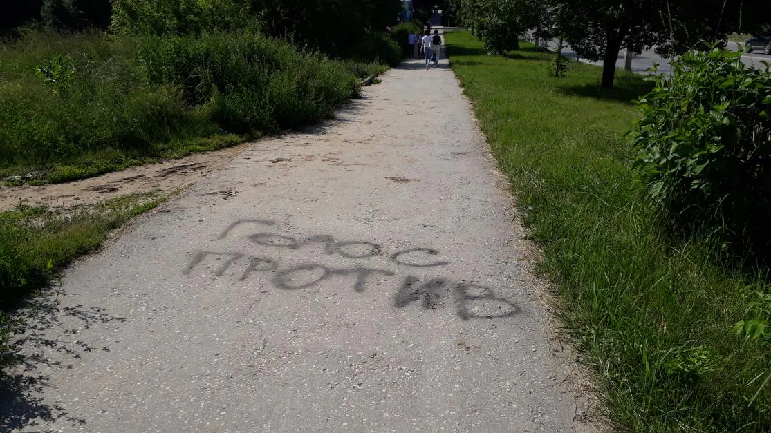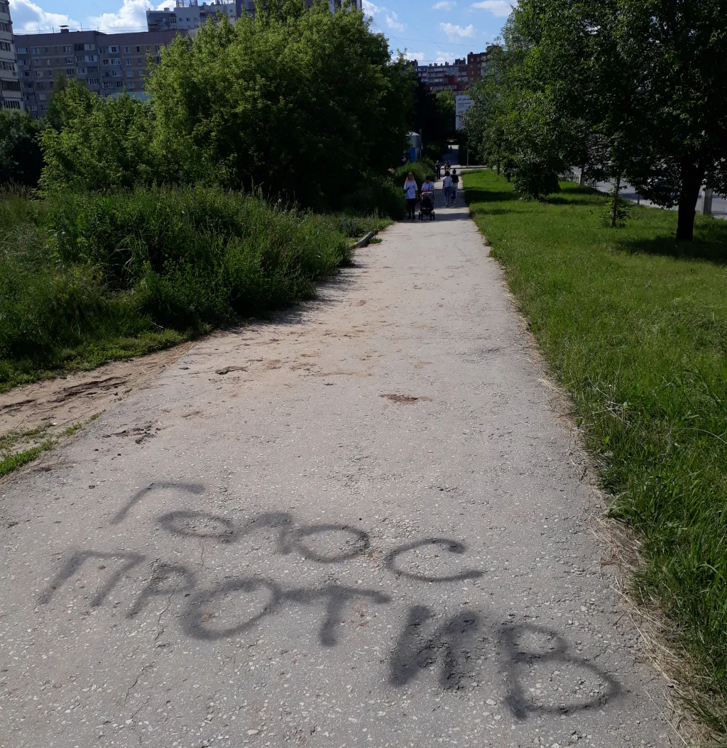 - Это тротуар возле озера на улице Новоселов, впереди видно дом №42. Полагаю, надпись появилась из-за голосования по поправкам, - написал читатель, приславший в редакцию фотографию.