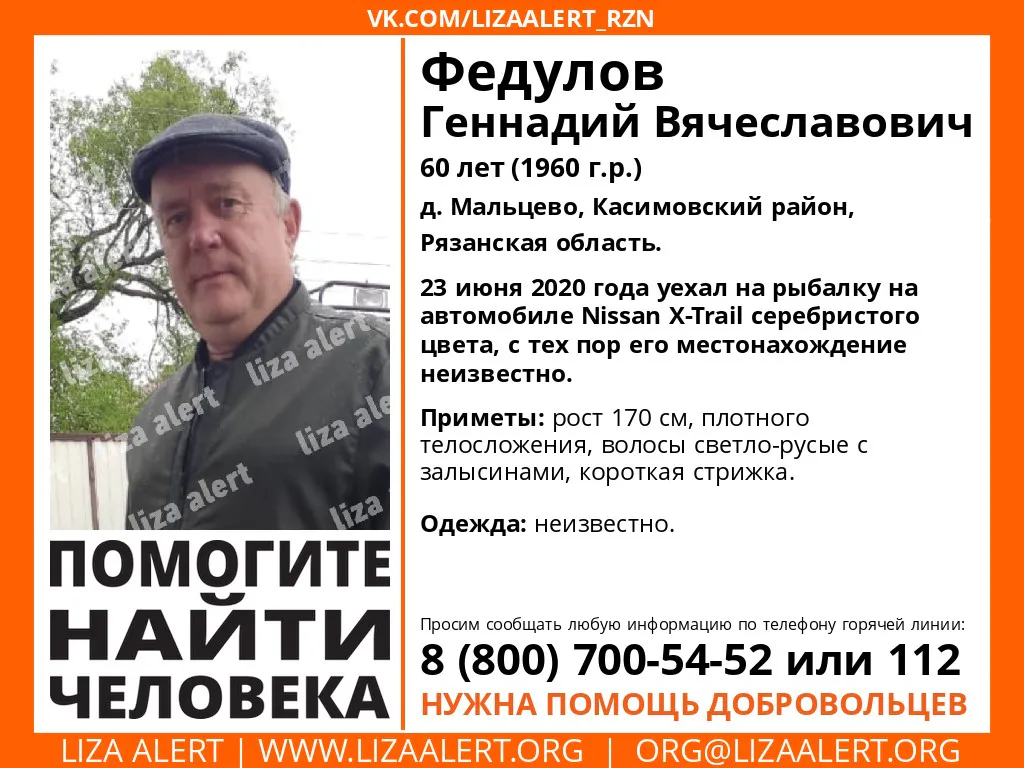 Приметы Геннадия Вячеславовича: рост 170 см, плотное телосложение, светло-русые волосы с залысинами, короткая стрижка. Если вы видели Геннадия Федулова или знаете, где он может находиться, сообщите по телефонас 8-800-700-54-52 или 112.