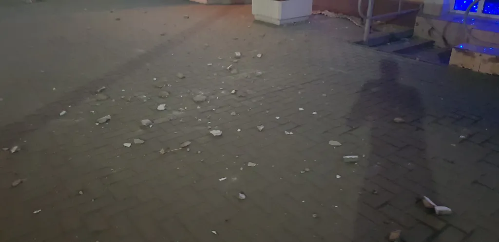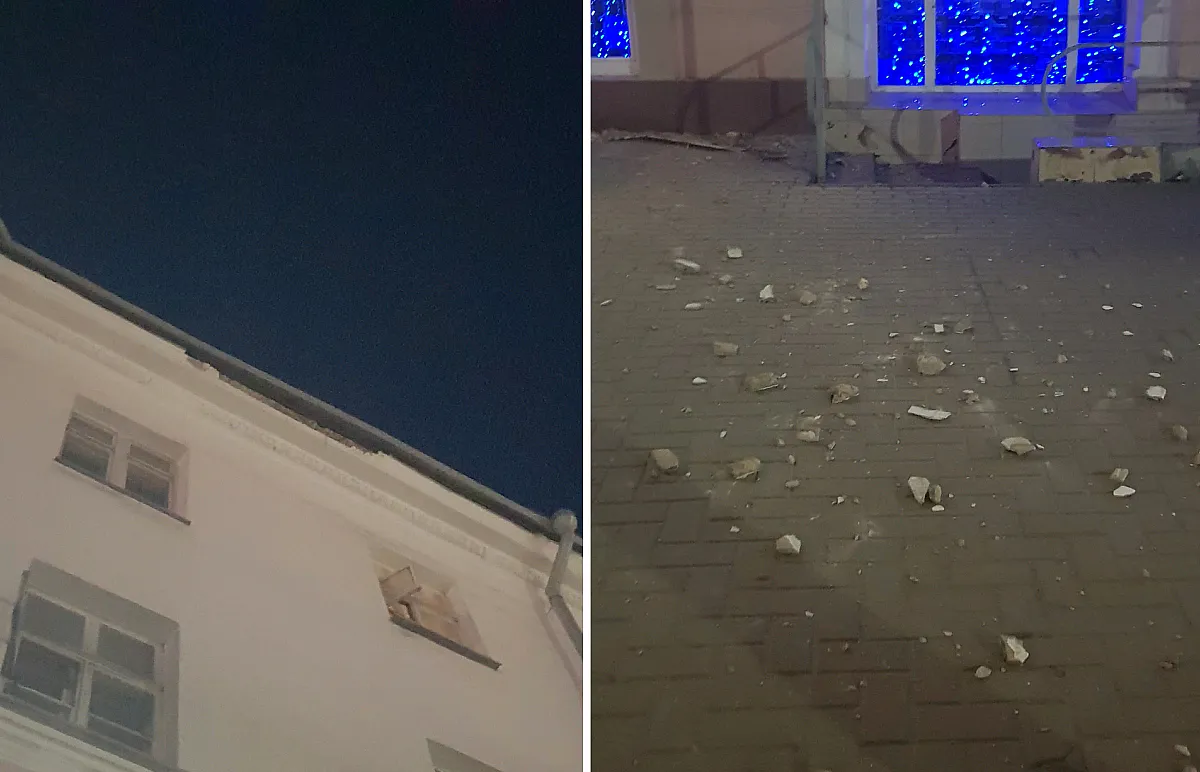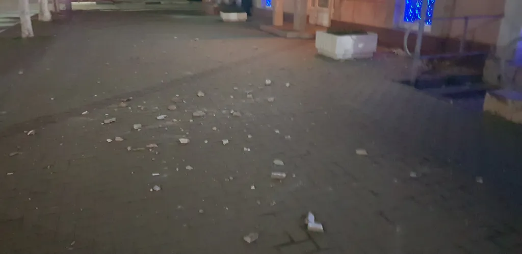 Очевидцы отмечают, что куски штукатурки разлетелись по всему тротуару