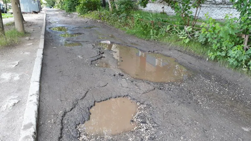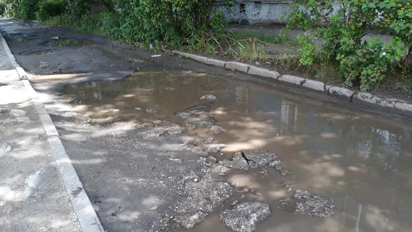После получения жалобы мы отправились на это место и сфотографировали его. Пройти здесь можно только по проезжей части, так как тротуара нет. Вся дорога действительно усеяна выбоинами и колдобинами. На большом участке полотна асфальта нет совсем. Во время дождя все выбоины заливает водой, из-за чего на дороге образуются огромные лужи.