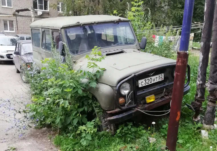 Судя по фотографиям, одинокий уазик действительно простаивает во дворе уже немало времени - автомобиль зарос травой, в которой может спрятаться ребенок. Для того, чтобы брошенный металлолом убрали, нужно обратиться в префектуру вашего района, которая входит в состав "Управления по делам территорий города Рязани". Телефон префекта Октябрьского района Рязани - 28-37-49. Почитать, чем занимается Управление по делам территорий, можно здесь.