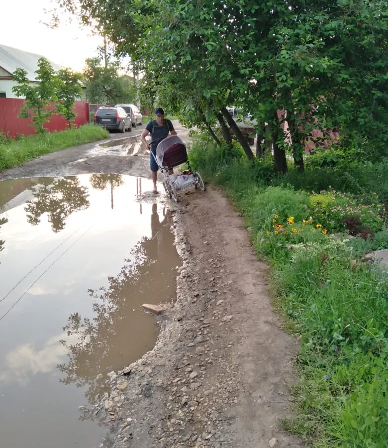Посмотреть, как местные жители с колясками преодолевают лужи, можно по этой ссылке.