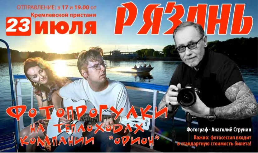 Кстати, 23 июля во время вечерней прогулки, на борту теплохода @teplohod_ryazan будет работать известный московский фотограф Анатолий Струнин. Он проведет фотосессию для всех, кто окажется на теплоходе во время рейса, отправлением в 17:10 и 19:10.