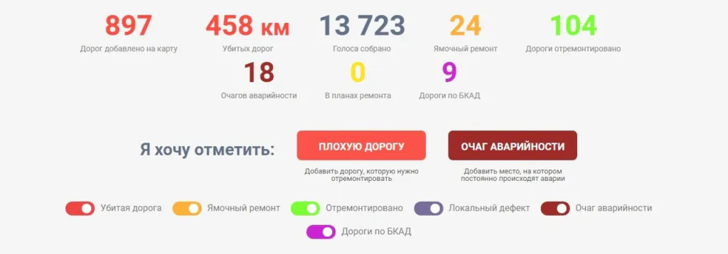 Оказывается, ОНФ однажды создал такую цифровую карту. На сайт может зайти любой человек и отметить убитую дорогу. Там можно увидеть, где убитые дороги, где идет ямочный ремонт, а также в каком месте присутствует локальный дефект, а где очаг аварийности.