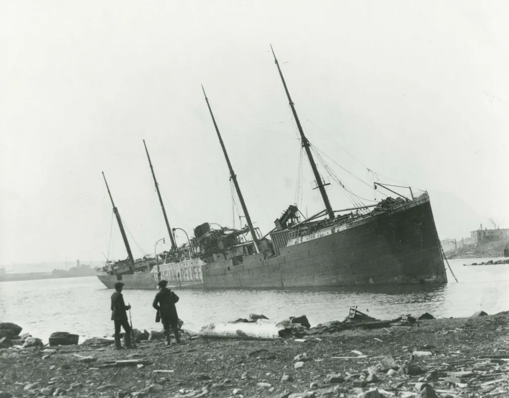 На корабле начался пожар, который команда потушить не смогла. Они решили спастись в шлюпках, оставив "Монблан" дрейфовать на волнах. Одинокий корабль уткнулся в деревянный пирс. Спустя некоторое время он взорвался.