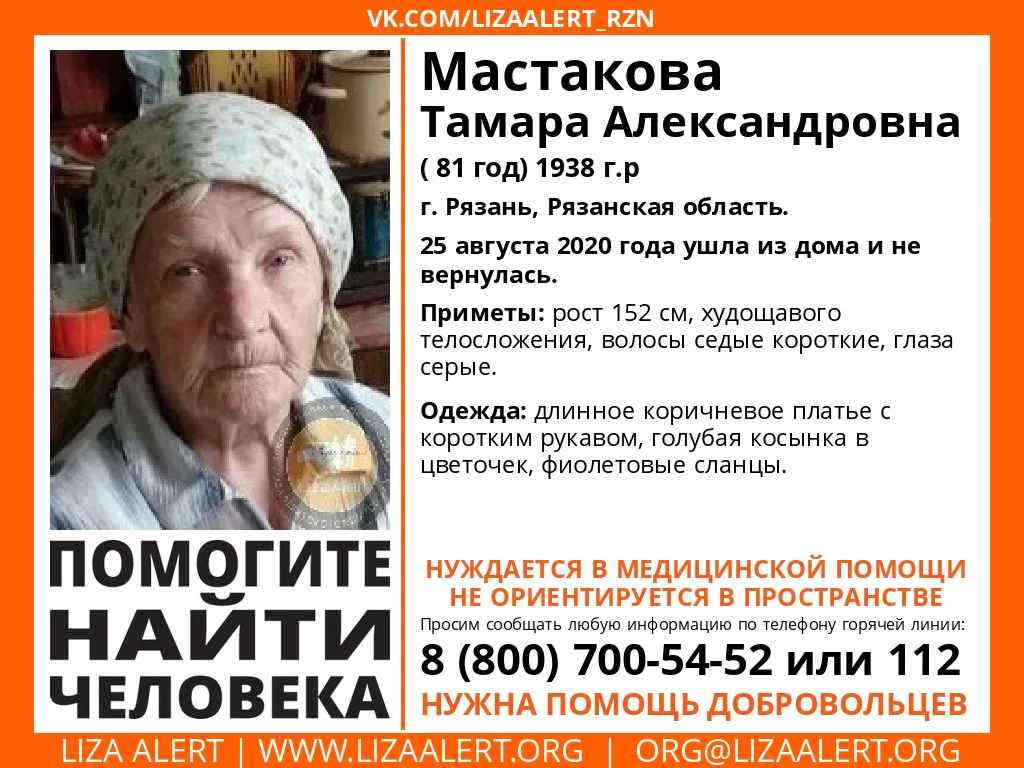 Пропавшая жительница Рязани, 81-летняя Тамара Мастакова найдена и жива. Об этом сообщили волонтеры поисково-спасательного отряда «Лиза Алерт» в своей группе ВКонтакте. Напомним, вчера активисты объявили в розыск пропавшую пенсионерку.