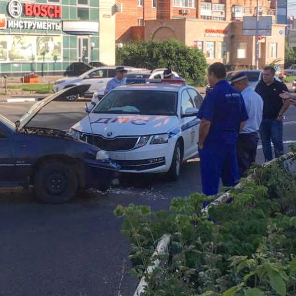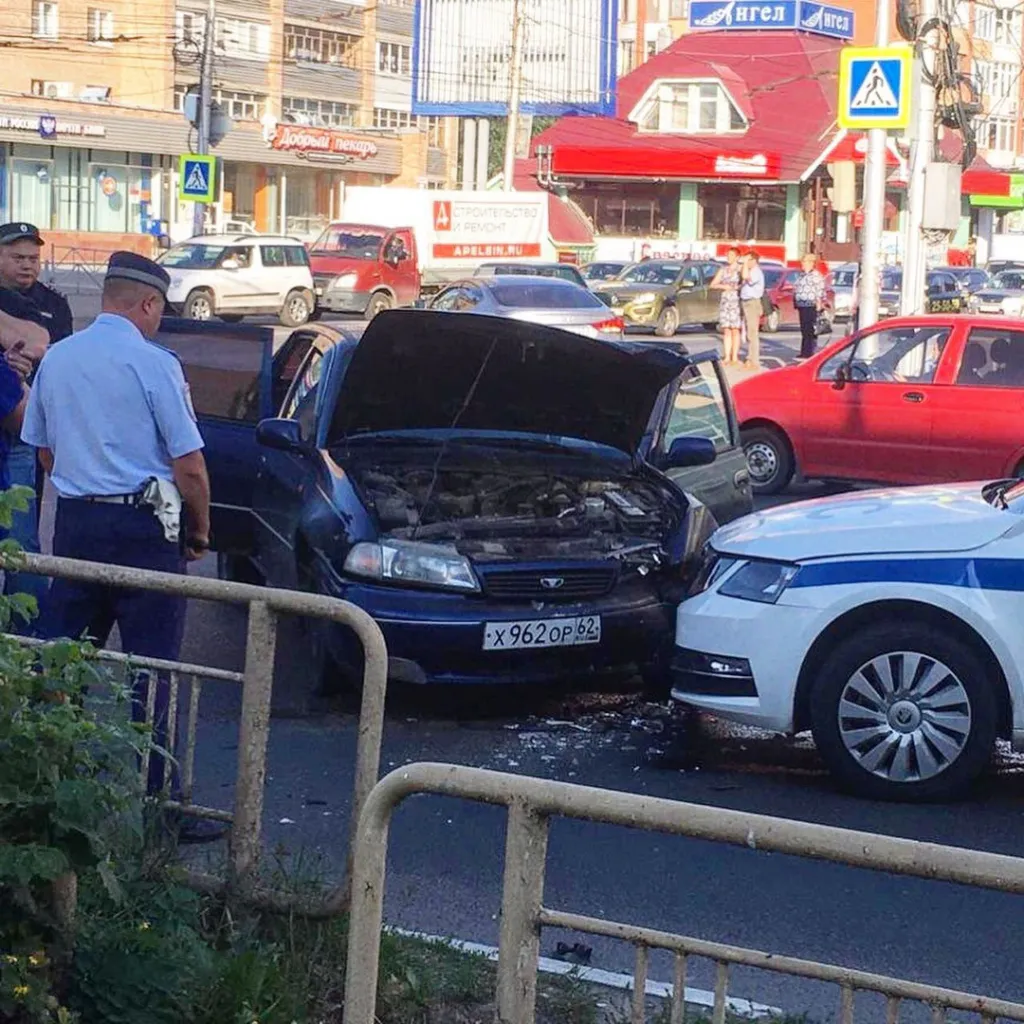 Утром в пятницу, 28 августа, в Рязани на пересечении улиц Есенина и Грибоедова произошло столкновение патрульного автомобиля ДПС ГИБДД «Шкода Октавия» и автомобиля «Дэу Нексия».