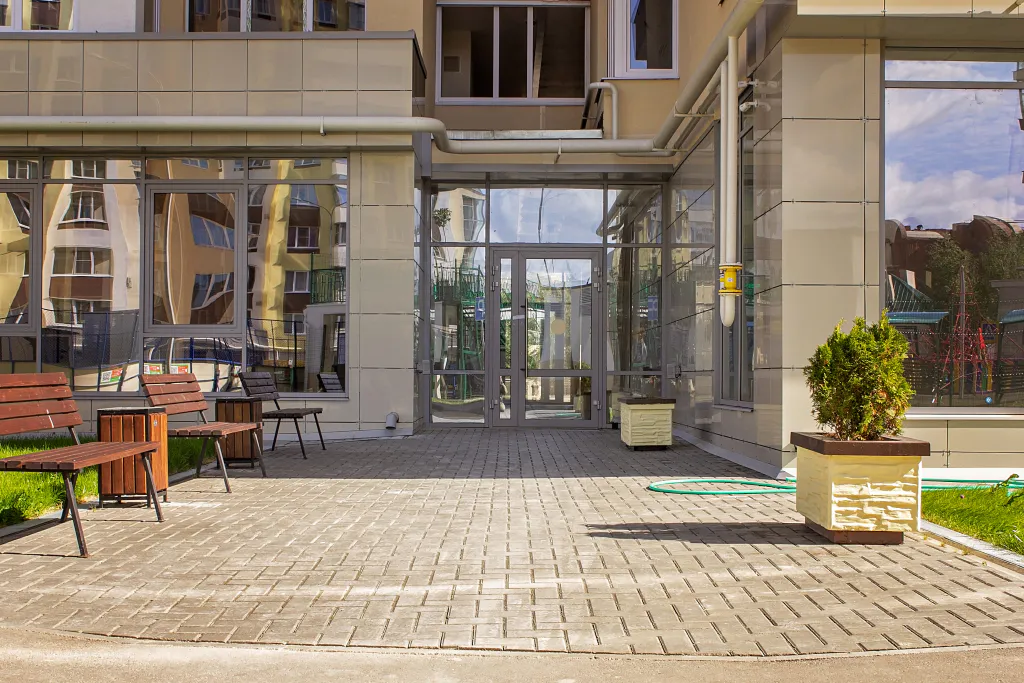 - безбарьерная среда — пешеходные и проезжие зоны выполнены на одном уровне, придомовая территория адаптирована для маломобильных групп населения;