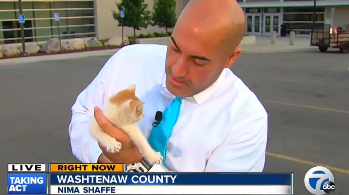 Рязань не в тренде - выкидывают кошек из окна, а в Америке журналист вышел в эфир с бездомным котенком
