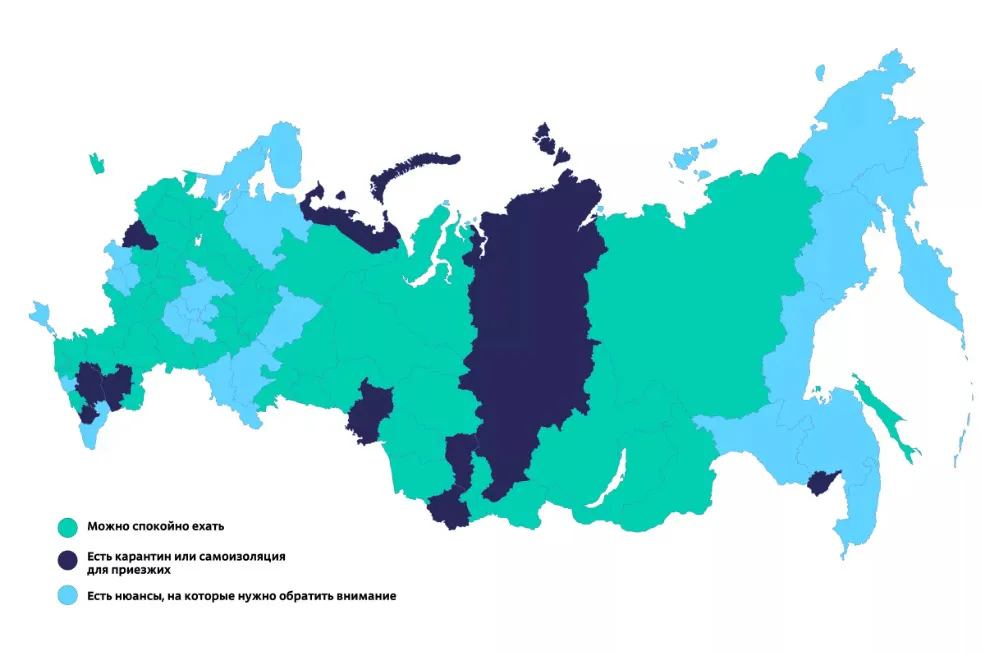 Однако, портал просит обратить внимание на некоторые нюансы. Например, в ряде областей, прибывшие из-за рубежа должны соблюдать карантин продолжительностью 14 дней, а в Ивановской области приезжие в регион из других субъектов РФ должны предоставить отрицательный ПЦР-тест на COVID-19.