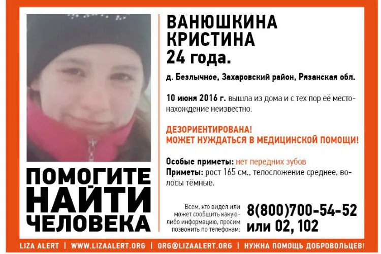 Напомним, 24-летняя Кристина Ванюша пропала 10 июня 2016 года. В тот день она вышла из своего дома в деревне Безлычное Захаровского района, с тех пор ее местонахождение неизвестно. Девушка выглядит младше своих лет, может быть дезориентирована и нуждаться в медицинской помощи.