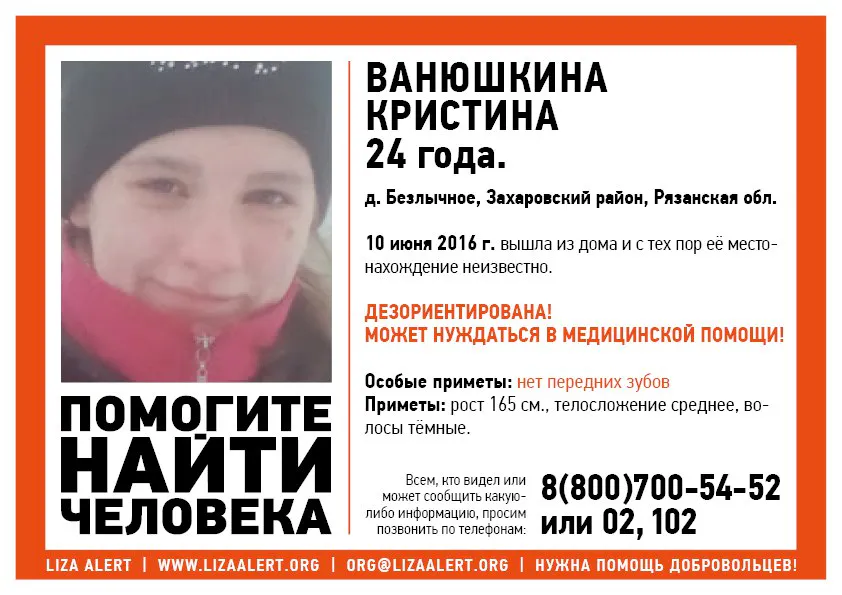 30 июня 2016 - Новости Рязани | progorod62.ru Стали известны подробности пропажи 24-летней девушки Кристины Ванюшкиной из деревни Безлычное Захаровского района.