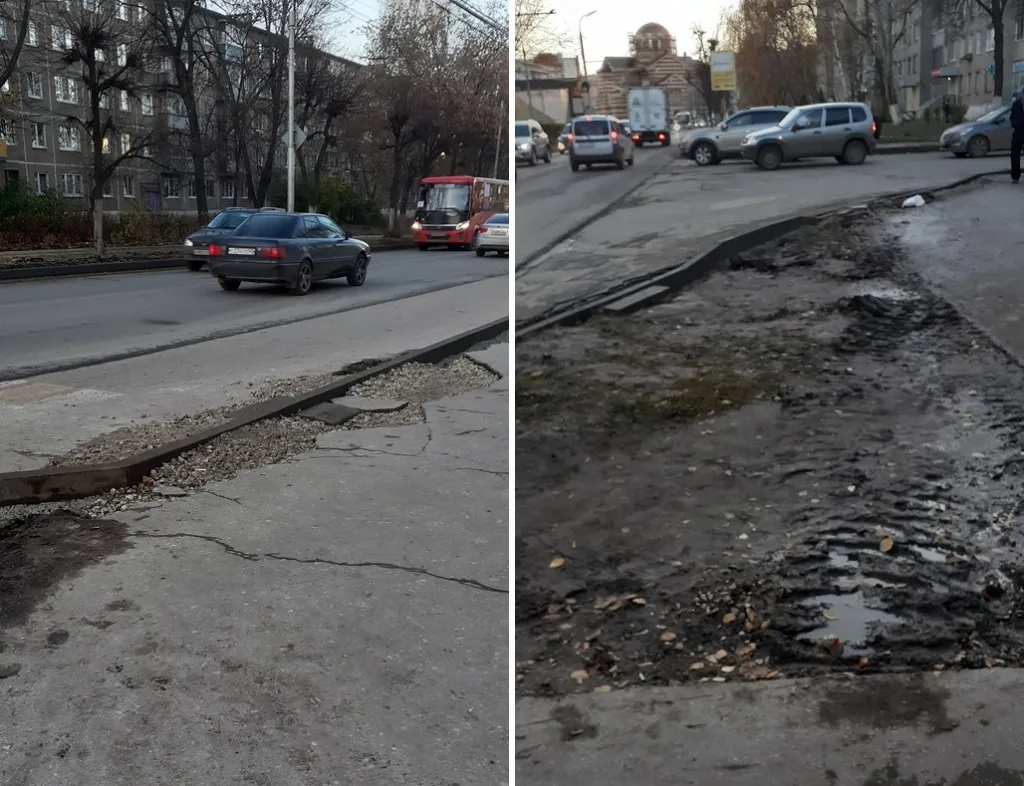 Ежедневно рязанка преодолевает эти тротуары с детской коляской, пытаясь перепрыгнуть через бордюр, высотой почти 30 сантиметров. После бордюра идет либо разбитый асфальт, либо щебень, либо грязь.