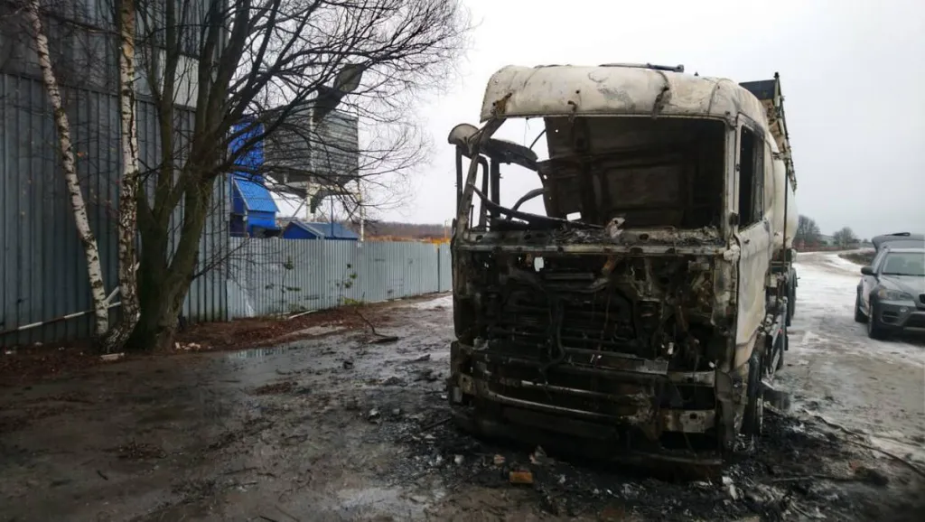 В ночь на вторник, 24 ноября, на трассе на улице Привокзальной в Милославском районе сгорел грузовик Scania. Фотографии с места происшествия опубликованы издательством “Пресса”.