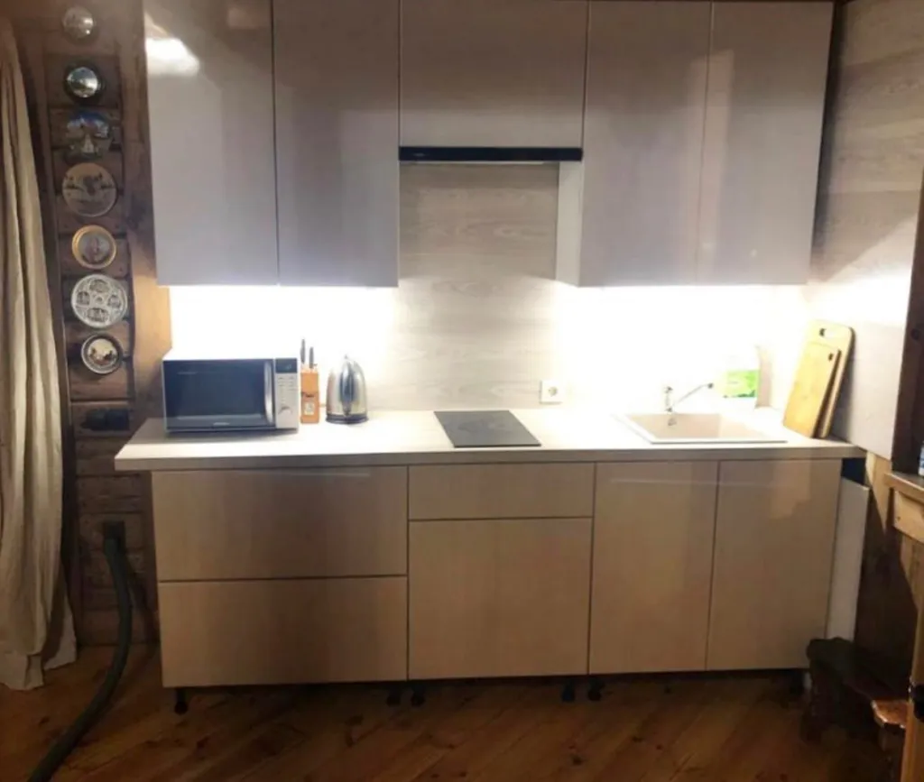 На фото как раз новенькая кухня, которую клиент «Интермебель» сам собрал и поделился своей гордостью. Её стоимость - 38750 руб. Фасад - МДФ в пленке ПВХ.