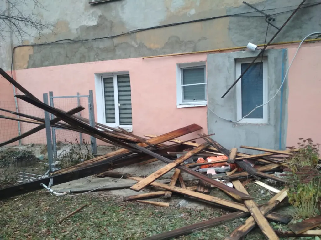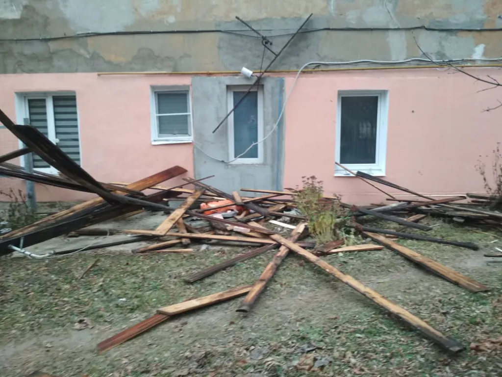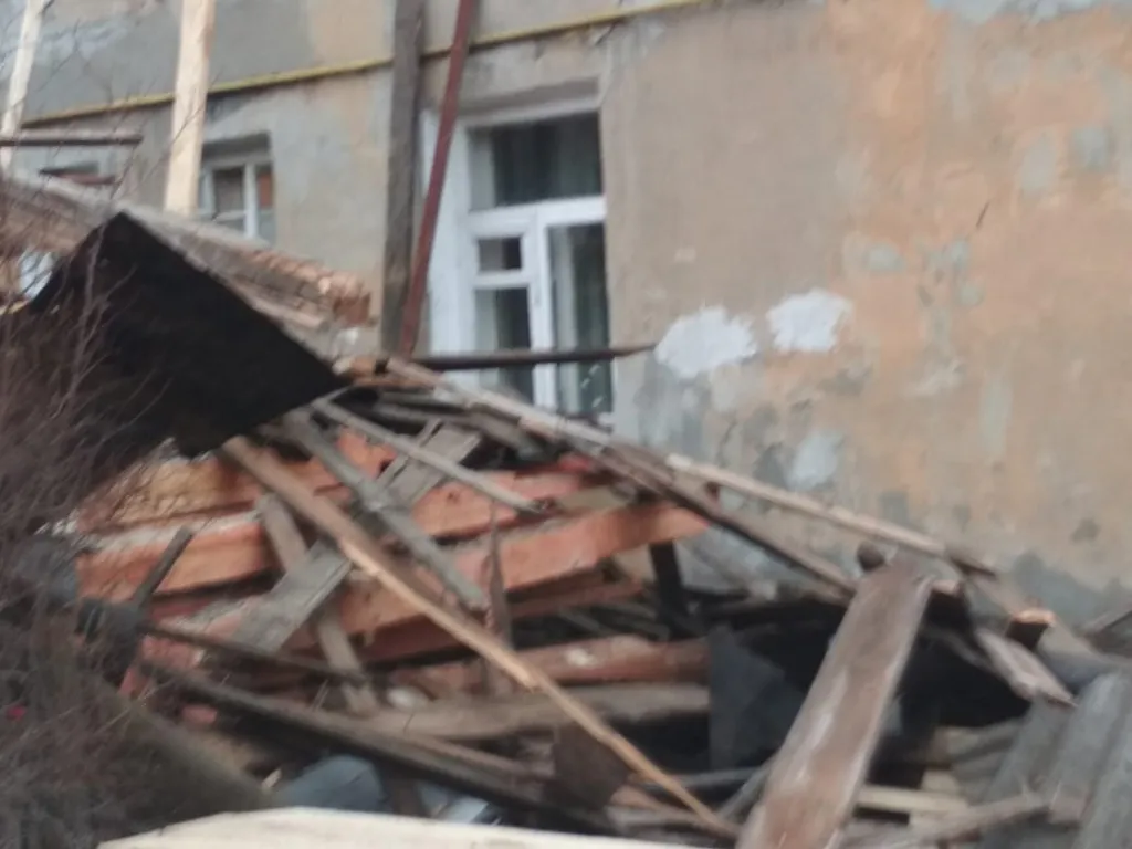 На фото можно заметить, что возле дома образовалась целая свалка из использованных строительных материалов. А из-за летящих досок и шифера повредило телевизионную антенну и электрические провода.