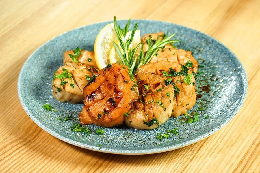 Гребешки нужно разморозить естественным образом на нижней полке холодильника. Удалить соединительный мускул и пленки. Промыть под холодной водой. Обсушить бумажным полотенцем. Если гребешки большие, то можно разрезать вдоль на 2 части, сделать с одной стороны насечку крест на крест. Сливочное масло растопить на сковороде, не давая ему гореть, добавить чеснок и веточку розмарина. Гребешок обжарить сначала насечкой вниз около 30 секунд с одной стороны, затем с другой стороны. Влить соевый соус, немного выпарить. Гребешок не стоит пережаривать, иначе он будет резиновым. В конце приготовления добавить нарезанную мелко петрушку, перемешать, снять с огня. Украсить зеленью и долькой лимона. Кстати, отличные живые морские гребешки продают в магазине DelikatesCLUB62.