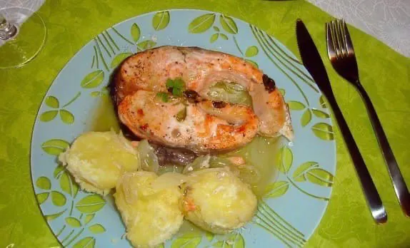 Готово! Подайте форель с вашим любимым гарниром, например с отварным рассыпчатым картофелем. Полейте его выделившимся при запекании рыбы соком - он прекрасно заменит соус, рядом лук.
