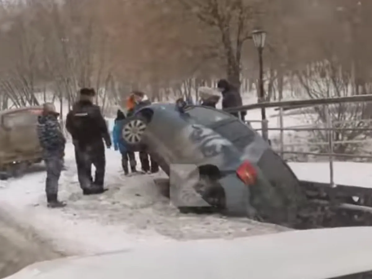 В Горроще произошла авария. Утром в субботу  на Голенчинском шоссе легковушка упала прямо под пешеходный мост. Видео с места происшествия появилось в соцсети "Вклнтакте".