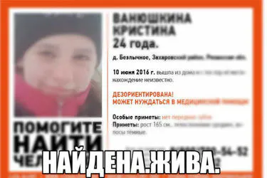 24-летнюю жительницу деревни Безлычное Захаровского района Кристину Ванюшкину нашли. Девушка жива. Об этом сообщается в группе поисково-спасательного отряда «Liza Alert Рязань».