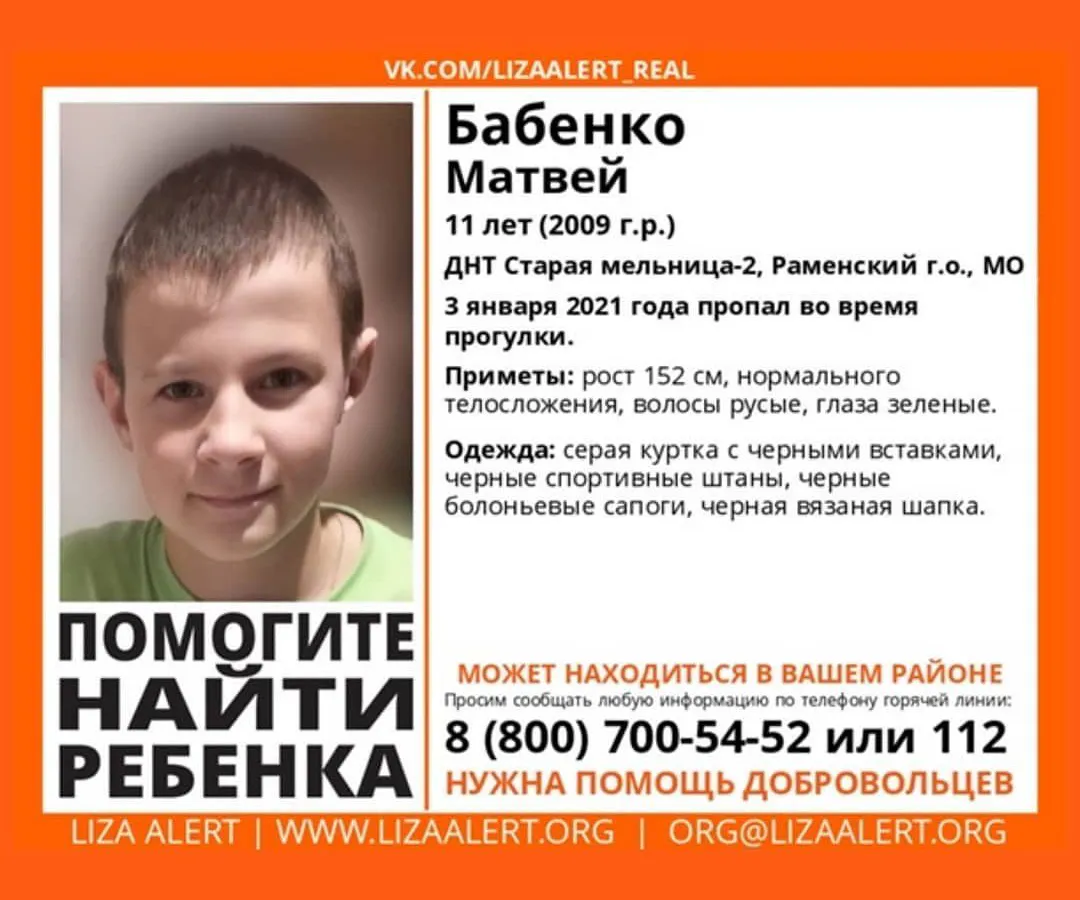 Рязанцев попросили помочь в поисках 11-летнего Бабенко Матвея. Он пропал во время прогулки в городе Раменское Московской области. Об этом сообщает ПСО «Лиза Алерт Рязань».