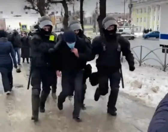На митинге в поддержку оппозиционера Навального в Рязани начались первые задержания. В социальных сетях появилось видео с места событий. На запись попали четыре бойца ОМОН, которые задержали и уводят одного из протестующих.