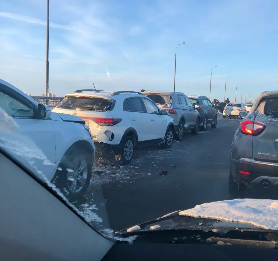 Утром 15 февраля на Солотчинском мосту произошла массовая авария - столкнулись сразу 11 машин подряд. Фото "паровозика" опубликованы в группе "Подслушано у Водителей Рязани".