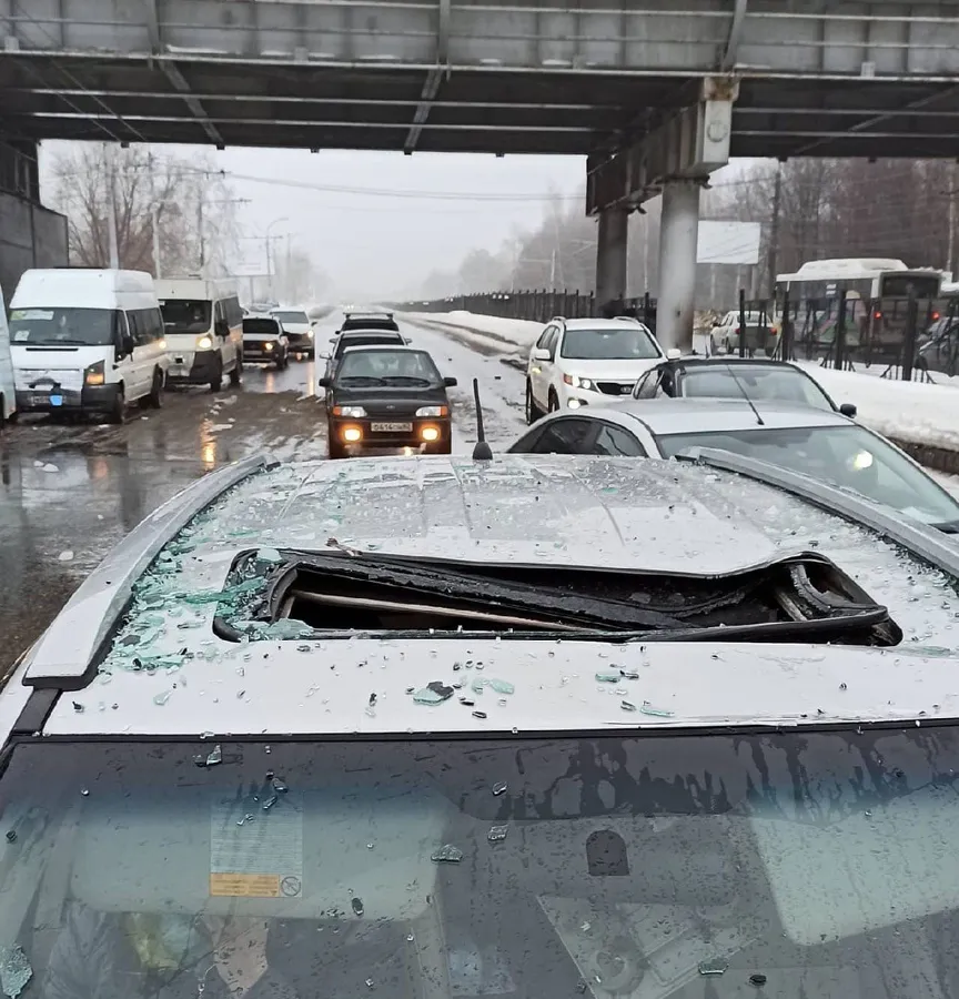 Похожая ситуация случилась позже на улице Урицкого - льдина повредила капот и разбила лобовое стекло.