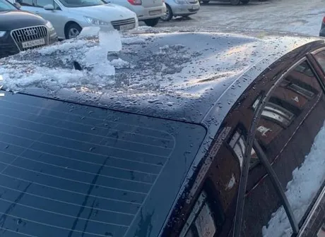 В Рязани на улице Грибоедова на крышу машины упала глыба льда. Об этом сообщила хозяйка автомобиля в социальных сетях. Инцидент произошел возле дома №8.