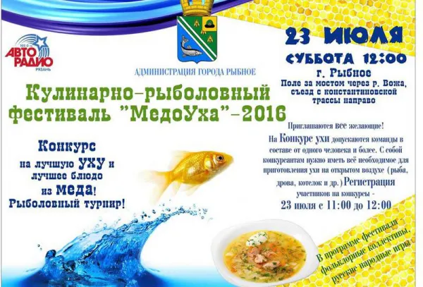 18 июля 2016 - Новости Рязани | progorod62.ruВ субботу, 23 июля, с 12:00 на окраине города Рыбное на берегу реки Вожа состоится премьера кулинарно-рыболовного фестиваля «МедоУха».