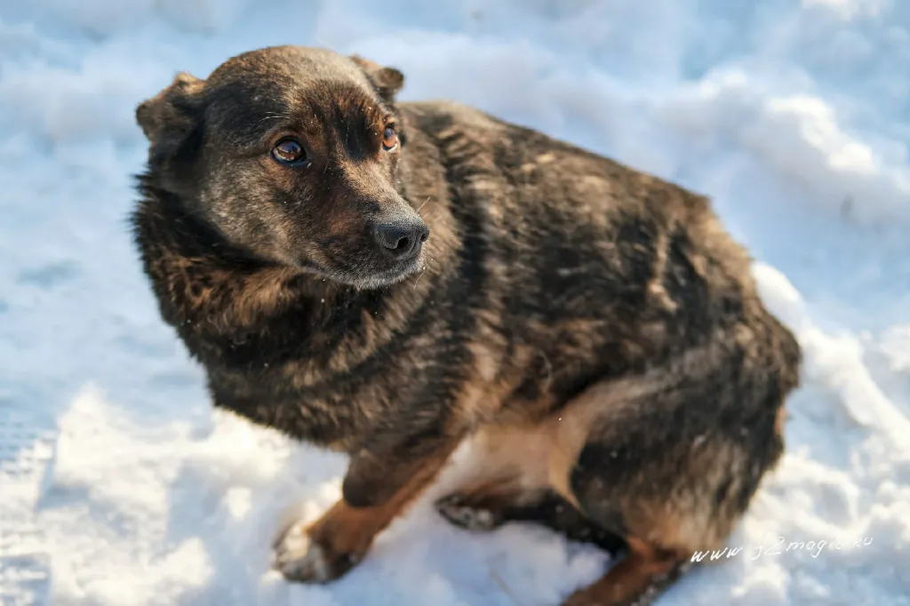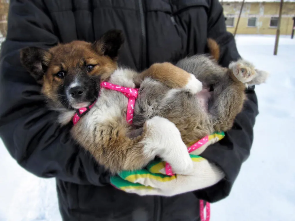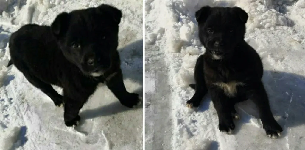 2 месяца, совсем кроха. Маму-овчарку забрала служба отлова, братья и сестры замерзли. Сейчас Пуговка живет на улице, ее подкармливают неравнодушные люди.