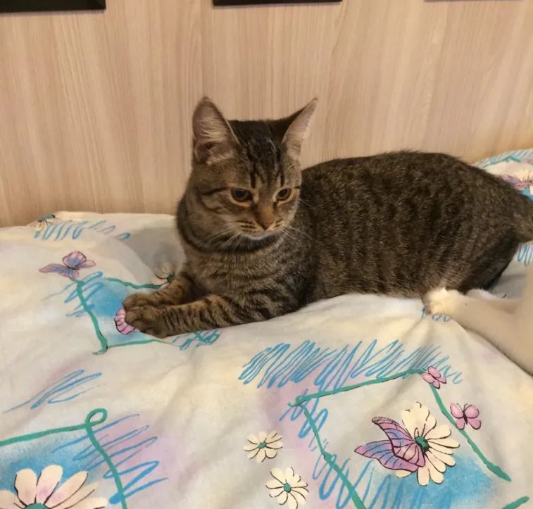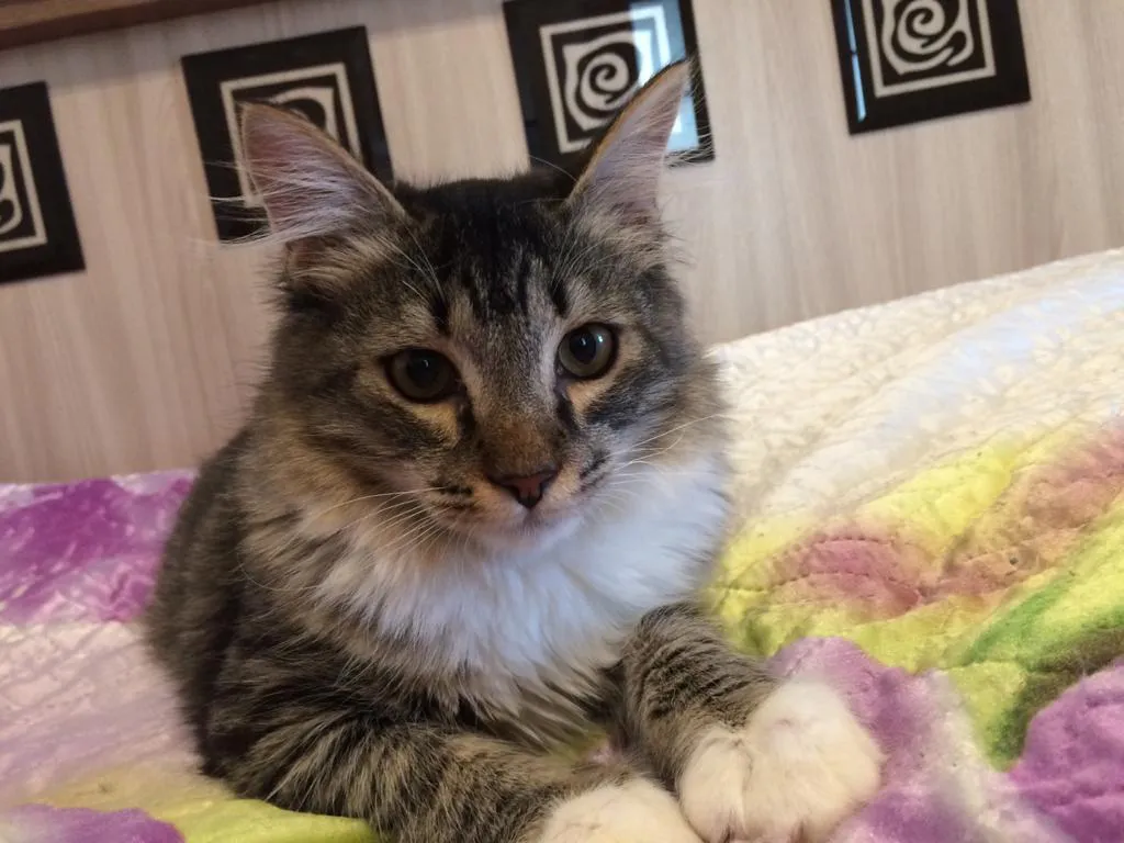 Примерно 8 месяцев. Полосатый, грациозный, с независимым характером. Кастрирован, приучен к лотку, будет верным и ласковым зверем.