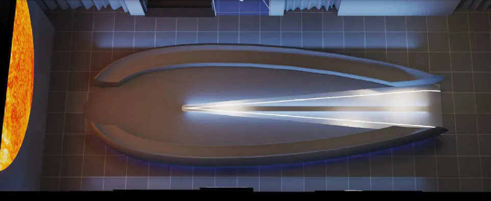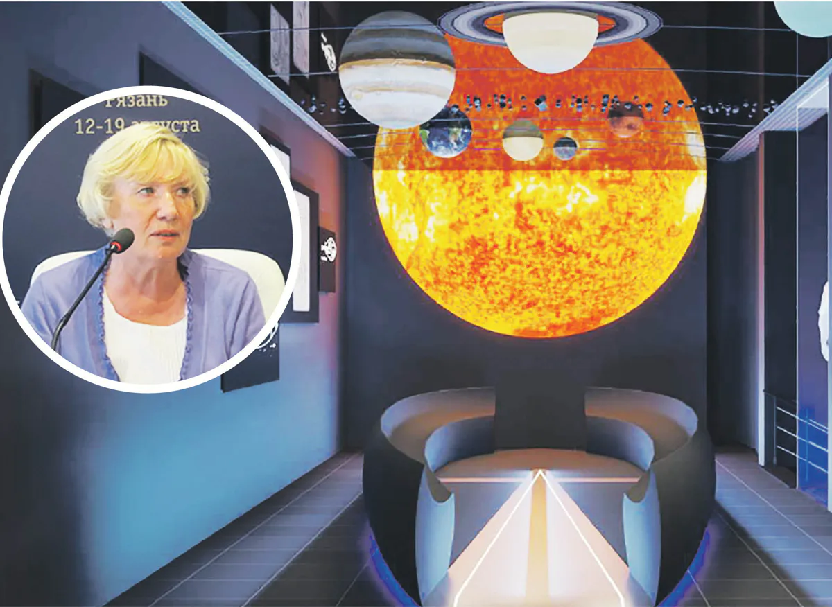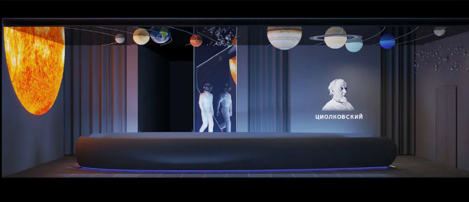 – В центре установят конструкцию, чья форма будет напоминать очертания ракеты. На потолке можно будет увидеть полусферы-планеты, а в конце зала – светящуюся полусферу-солнце. Потолок сделают черным и глянцевым, благодаря этому возникнет эффект отражения – планеты станут объемнее. По правую руку на стене будет висеть светящийся портрет Циолковского, а по левую разместятся плоскости для проекций, которые будут демонстрировать в ходе посещения, – говорит директор.