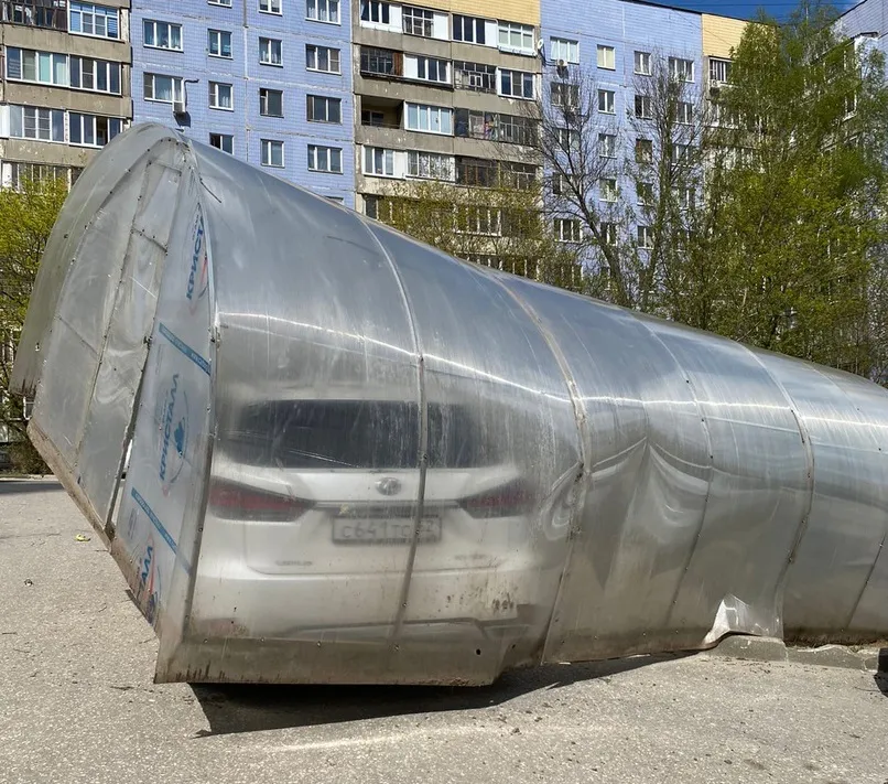 Сегодня, 5 мая, на улице Новосёлов в Песочне улетевшая теплица накрыла автомобиль. Фото забавного инцидента появились в группе "Рязань" Вконтакте.