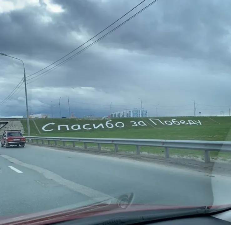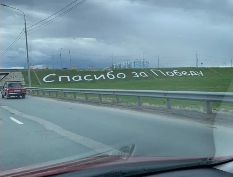 К 9 мая на въезде в Рязань со стороны Солотчинского шоссе появилась надпись "Спасибо за Победу". Фото выложили в группе "RZN LIFE" Вконтакте.
