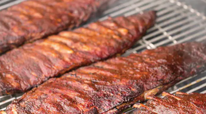 Все ингредиенты для приправы перемешать и натереть ребрышки. Оставить мариноваться в течение часа. Ингредиенты для соуса барбекю перемешать, подогреть в кастрюле и варить на маленьком огне в течение 1 часа, пока соус слегка не загустеет. Постоянно помешивать. Ребрышки посолить, положить в подставку-сетку для ребрышек и готовить на среднем жару в течение 1 – 1 ½ часов. За 20 минут до готовности обмазать ребрышки соусом барбекю. Оставшийся соус подать к столу.