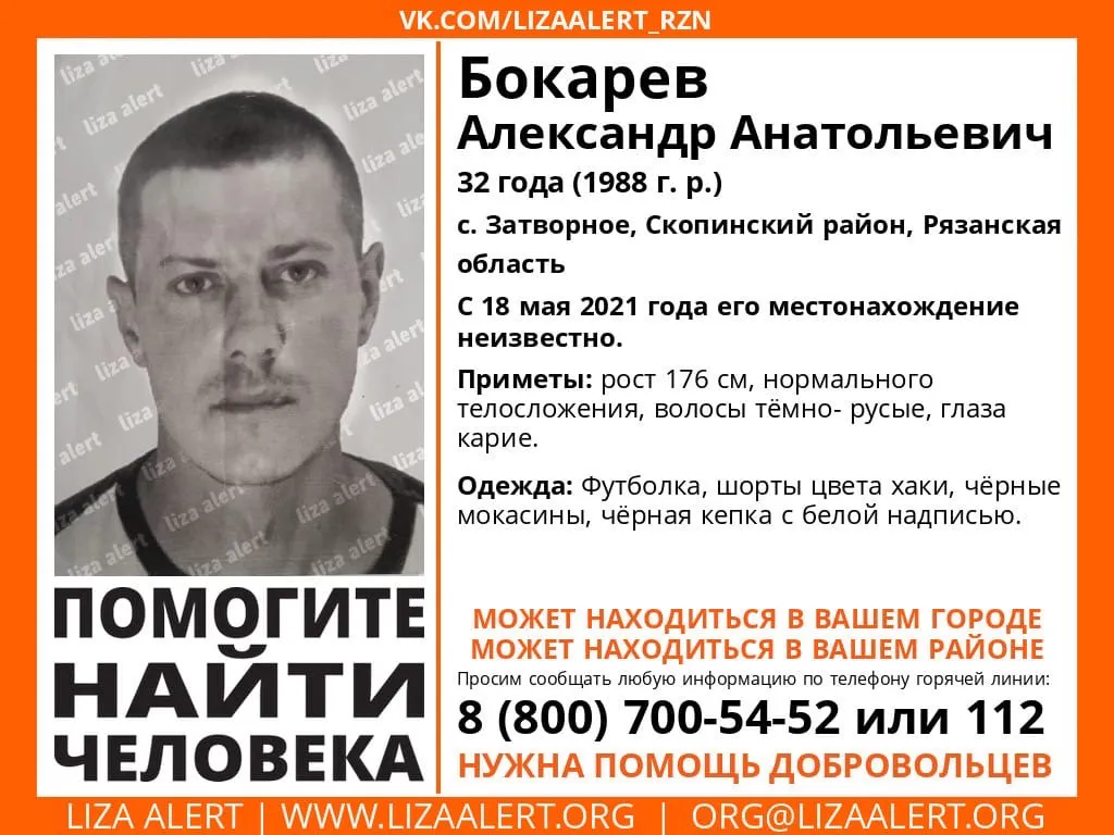В селе Затворное Скопинского района пропал 32-летний Александр Бокарев. Об этом сообщают в группе поисково-спасательного отряда “Лизаалерт Рязань”. Александр ушел из дома 18 мая 2021 года - с тех пор его местонахождение неизвестно.