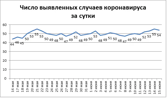 Судя по статистике, ситуация с заболеваемостью в Рязанской области остается стабильной. За последние 31 день не было случаев, когда количество заболевших достигло хотя бы 60 пациентов в сутки. Максимальное количество заболевших было зафиксировано 21 мая и 14 июня - 55 человек, минимальное - 16 мая, 44 человека.