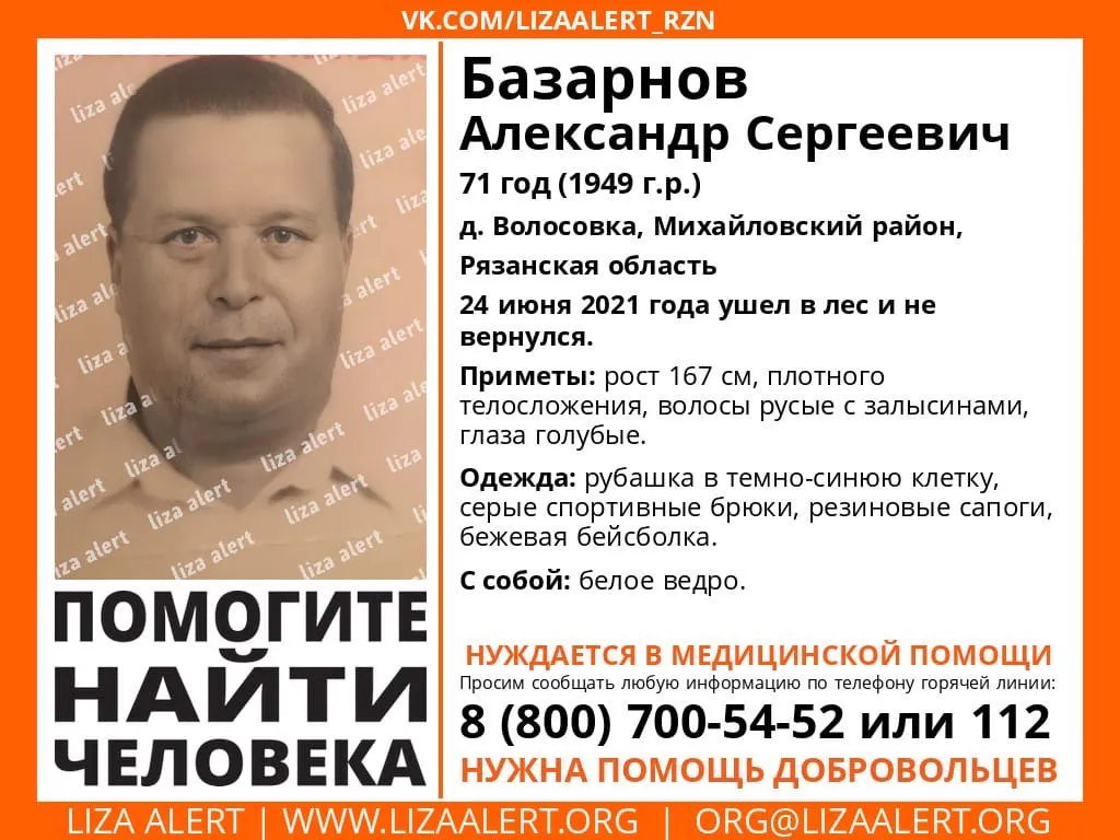 Активисты поисково-спасательного отряда "Лиза Алерт" объявили в розыск 72-летнего Александра Базарнова. По информации волонтеров ПСО, мужчина ушел из дома в лес и не вернулся в четверг, 24 июня. Они добавили, что михайловец может нуждаться в медицинской помощи.