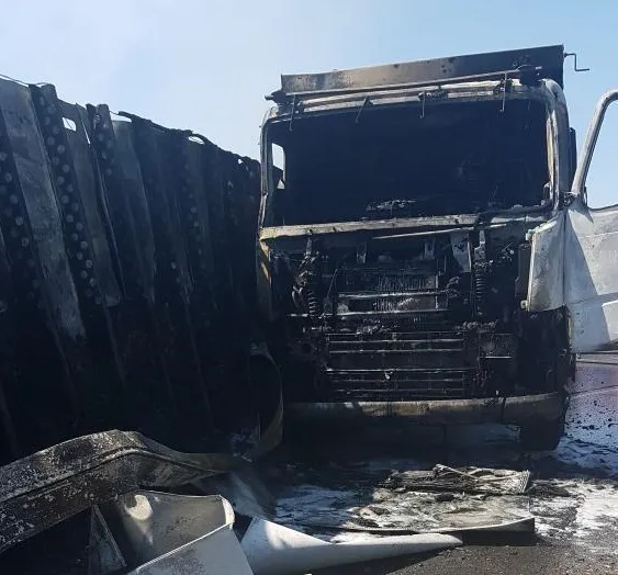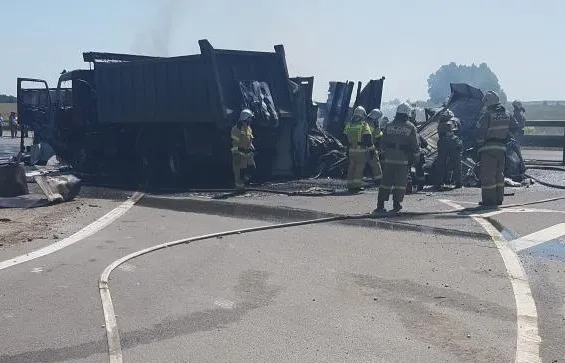 Авария произошла в районе часа дня. Фура сгорела полностью, ее тушили пожарные. По данным источника, водитель фуры получил травмы, его напарник погиб - тело пытаются достать из машины. Дорожные рабочие не пострадали. На месте работают спасательные бригады, медики и полицейские.