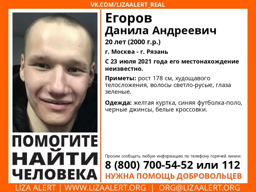 Волонтёры отряда «Лиза Алерт Рязань» розыскивают Егорова Данилу Андреевича, 2000 года рождения. С 23 июля 2021 года его местонахождение неизвестно.